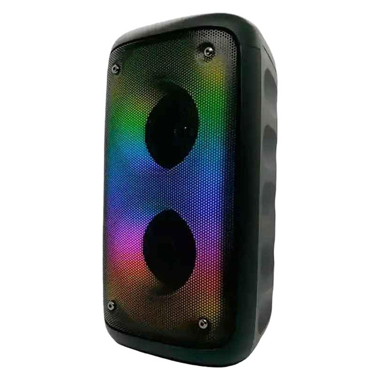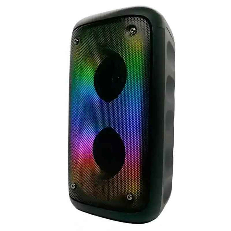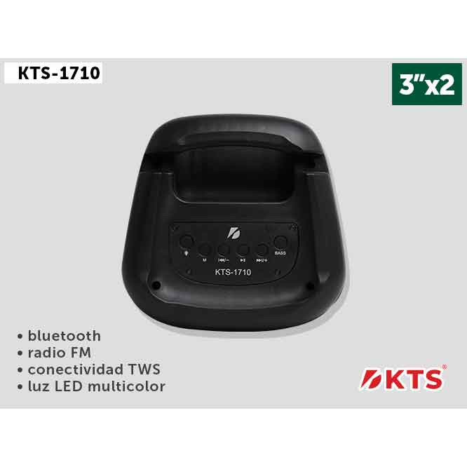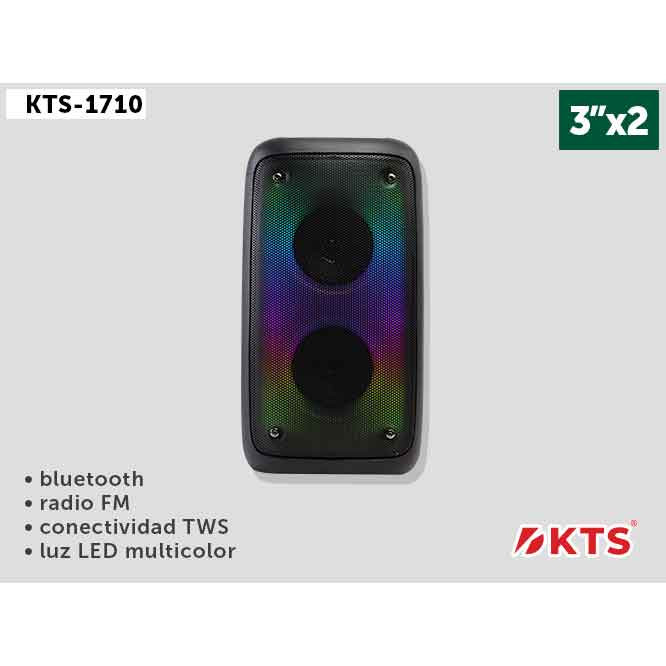 اسپیکر بلوتوثی قابل حمل مدل KTS-1710 یک محصول با ابعاد 15x29x13 سانتی متر و وزن 1200 گرم می باشد که باتوجه به کیفیت مناسبی که دارد از قیمت معقولی برخوردار است.این اسپیکر دستی و قابل حمل دارای 2 باند 34 اینچی می باشد که صدای خروجی بسیار خوبی دارد. بدنه این محصول از جنس پلاستیک می باشد که در نمای بالا یک صفحه کلید شامل دکمه های توقف، پخش، قبلی و بعدی و … با دسترسی بهتر برای کنترل آسان در نظر گرفته شده است. همچنین یک فرورفتگی برای قرارگیری دست در آن تعبیه شده است. از مزیت های این دستگاه وجود نورپردازی RGB می باشد که با LED های خوش رنگ و با کیفیت، نوردهی زیبایی را انجام می دهد و می توان در مواقع دلخواه آن ها را تنظیم کرده و خاموش و روشن نمود. اسپیکر بلوتوثی قابل حمل مدل KTS-1710 دارای یک باطری لیتیومی از نوع شارژی با ظرفیت 1800 میلی آمپر می باشد که برای استفاده در طبیعت و خارج از منزل کاربردی است. این باطری توسط کابل شارژ microUSB شارژ می گردد که در بسته بندی محصول قرار گرفته است.این بلندگو با پشتیبانی از بلوتوث قابلیت سازگاری با تمام دستگاه ها مانند تلفن همراه، تبلت و… با سیستم عامل های IOS و اندروید را دارد. همچنین امکان پخش از طریق فلش و کارت حافظه و درگاه میکروفن در آن فراهم می باشد.