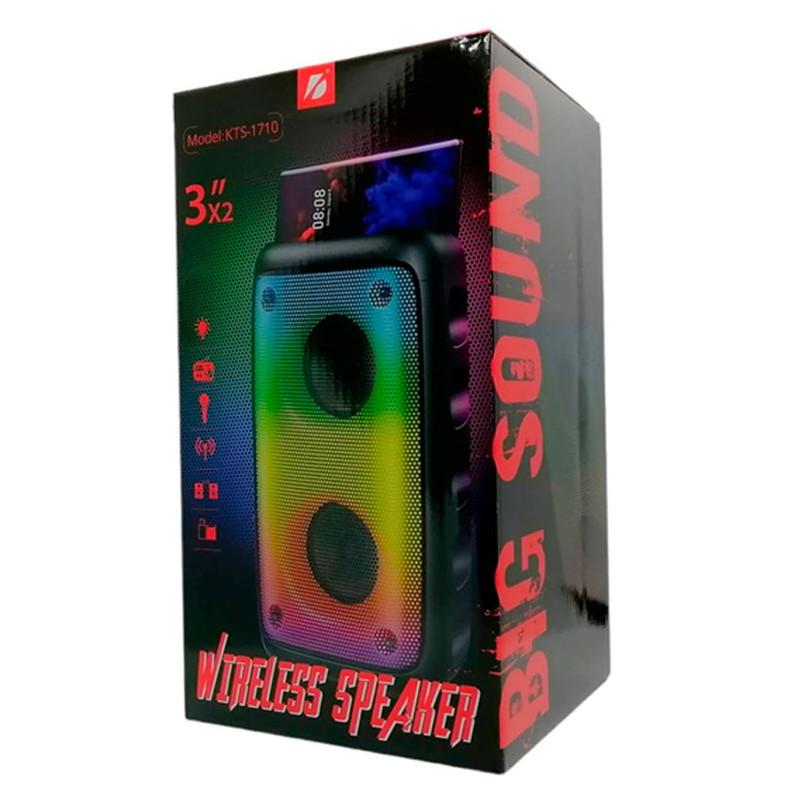 اسپیکر بلوتوثی قابل حمل مدل KTS-1710 یک محصول با ابعاد 15x29x13 سانتی متر و وزن 1200 گرم می باشد که باتوجه به کیفیت مناسبی که دارد از قیمت معقولی برخوردار است.این اسپیکر دستی و قابل حمل دارای 2 باند 34 اینچی می باشد که صدای خروجی بسیار خوبی دارد. بدنه این محصول از جنس پلاستیک می باشد که در نمای بالا یک صفحه کلید شامل دکمه های توقف، پخش، قبلی و بعدی و … با دسترسی بهتر برای کنترل آسان در نظر گرفته شده است. همچنین یک فرورفتگی برای قرارگیری دست در آن تعبیه شده است. از مزیت های این دستگاه وجود نورپردازی RGB می باشد که با LED های خوش رنگ و با کیفیت، نوردهی زیبایی را انجام می دهد و می توان در مواقع دلخواه آن ها را تنظیم کرده و خاموش و روشن نمود. اسپیکر بلوتوثی قابل حمل مدل KTS-1710 دارای یک باطری لیتیومی از نوع شارژی با ظرفیت 1800 میلی آمپر می باشد که برای استفاده در طبیعت و خارج از منزل کاربردی است. این باطری توسط کابل شارژ microUSB شارژ می گردد که در بسته بندی محصول قرار گرفته است.این بلندگو با پشتیبانی از بلوتوث قابلیت سازگاری با تمام دستگاه ها مانند تلفن همراه، تبلت و… با سیستم عامل های IOS و اندروید را دارد. همچنین امکان پخش از طریق فلش و کارت حافظه و درگاه میکروفن در آن فراهم می باشد.
