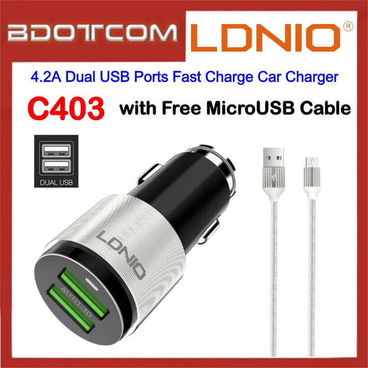 شارژر فندکی LDNIO C403 توانایی شارژ گوشی و تبلت را دارا بوده و یک کابل شارژنیز همراه آن است. این شارژر فندکی پر قدرت با داشتن دو خروجی USB مجزا میتواند دو دستگاه را بهطور همزمان شارژ کند. به لطف شدت جریان خروجی 5 ولت 4.2 آمپری، امکان شارژ تمامی دستگاه ها هم وجود دارد.LDNIO C403 با طراحی شیک،ابعاد مناسب قیمت پایین و بازده خوبی که دارد بهخوبی میتواند نیاز به همراه داشتن دو شارژ را برطرف کند و برای اندروید و ios کاربرد دارد.بدنه این شارژر فندکی با استفاده از جدیدترین تکنولوژی های روز ساخته شده و بدنه ای با کیفیت ساخت بالا،مقاوم در برابر آتش است.قابلیت و تکنولوژی جدیدی که به تازگی به برخی محصولات کمپانی LDNIO اضافه شده Auto-ID می باشد که به رغم وجود این خصیصه شارژ این توانایی را یافته که شدت جریان خروجی را بسته به دستگاه متصل به آن به خوبی تنظیم و کنترل کند و به نوعی سبب افزایش عمر باتری دستگاه متصل نیز شود.پنل رابط پورت های خروجی این شارژر از نوع USB 3.0 بوده که این نیز خود سبب افزایش سرعت شارژ می شود.همراه با شارژر فندکی یک عدد کابل میکرو یو اس بی از نوع تخت "فلت" نیز در بسته قرار دارد.این شارژر فندکی 4.2 آمپری پر قدرت با چندین دستگاه تست شده و سرعت شارژ بالایی را ارائه می دهد.