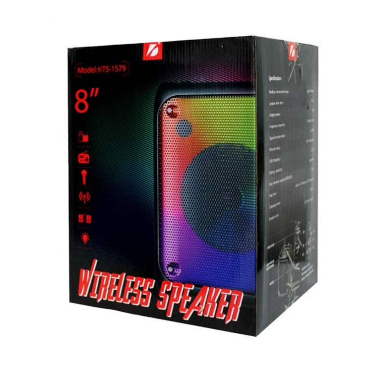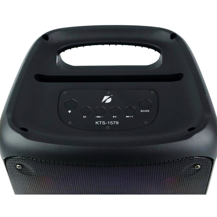 اسپیکر بی سیم قابل حمل مدل KTS-1579 مدت زمان شارژدهی در حالت پخش موسیقی حدود 1 الی 2 ساعت با میزان صدای 75 درصدی و مدت زمان مورد نیاز برای شارژ شدن حدود 3 ساعت بهرمندی از ورودی میکروفون جهت اتصال میکروفون، حساسیت سیگنال به نویز 80 دسی بل و حداکثر حافظه قابل پشتیبانی 32 گیگابایت پشتیبانی از فلش مموری USB و رم میکرو SD، رادیو FM برای علاقمندان به رادیو و… دارای نورپردازی داخلی جهت ایجاد جلوه بصری زیبا مجهز به درایو 8 اینچ جهت پخش صدای واضح و شفاف، توان خروجی کلی 20 وات و پاسخ فرکانسی 100 هرتز الی 20 کیلوهرتز برخودار از کلید های فیزیکی جهت مدیریتی موسیقی، تنظیم ولوم و… وجود شیار در نزدیکی دسته جهت قرار دادن تلفن همراه تامین انرژی از طریق باتری داخلی با ظرفیت 2400 میلی آمپر ساعت و امکان شارژ مجدد از طریق کابل میکرو یو اس بی امکان اتصال بی سیم از طریق بلوتوث با برد اتصال 10 متری و اتصال با سیم از طریق رابط جک 3٫5 میلی متری صدا دارای بدنه ای مقاوم در برابر ضربه و فشار از جنس پلاستیک، مجهز به دسته جهت حمل آسان تر