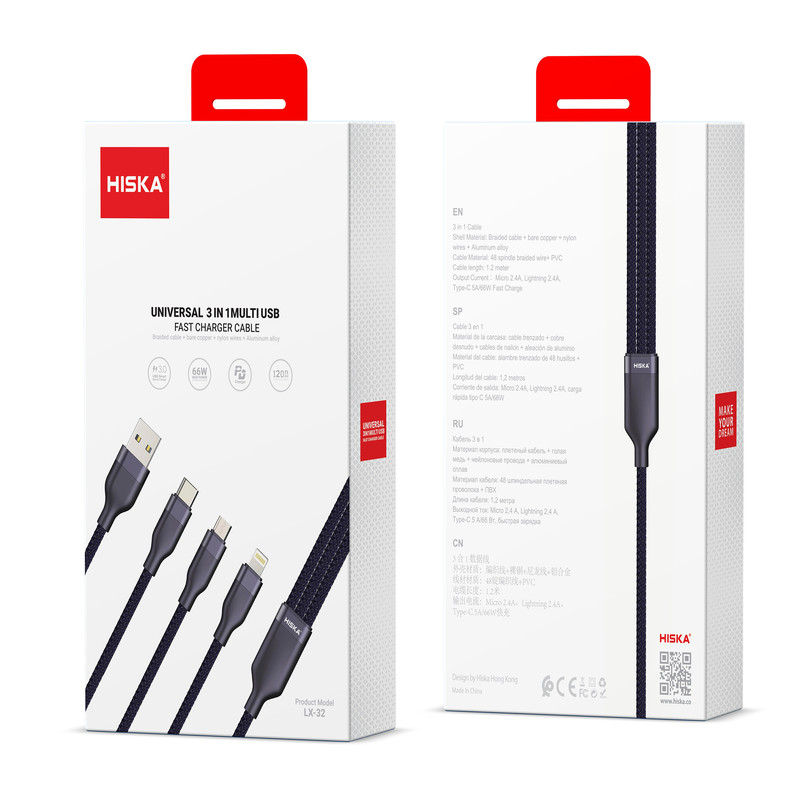 کابل شارژ سریع 3 در 1 HISKA مدل LX-32، یک محصول حرفهای و کاربردی است که نیازهای شما را برای شارژ همزمان دستگاههای مختلف برآورده میکند. این کابل با استفاده از مواد باکیفیتی مانند مس خالص، سیمهای نایلونی بافتهشده و روکش آلومینیومی طراحی شده است تا دوام و عملکرد بالایی داشته باشد. طول 1.2 متری آن همراه با قابلیت پشتیبانی از شارژ سریع تا 66 وات، تجربهای بینظیر از سرعت و کارایی را فراهم میآورد. این کابل دارای سه درگاه مختلف (میکرو USB، لایتنینگ و تایپ سی) است که امکان استفاده از آن را برای انواع دستگاهها از جمله گوشیهای هوشمند، تبلتها و سایر ابزارهای دیجیتال فراهم میکند. با قابلیت انتقال جریان بالا (تا 5 آمپر)، این محصول به شما این اطمینان را میدهد که دستگاههای شما در کوتاهترین زمان ممکن و به صورت ایمن شارژ شوند. بدنه این کابل با روکش نایلونی بافتهشده طراحی شده است که علاوه بر زیبایی، مقاومت بالایی در برابر کشیدگی، خمیدگی و سایش دارد. کابل HISKA مدل LX-32، نه تنها نیازهای روزمره شما را برطرف میکند، بلکه با دوام بالا و طراحی زیبا، یک انتخاب ایدهآل برای کاربران حرفهای و افرادی است که به کیفیت و عملکرد اهمیت میدهند.