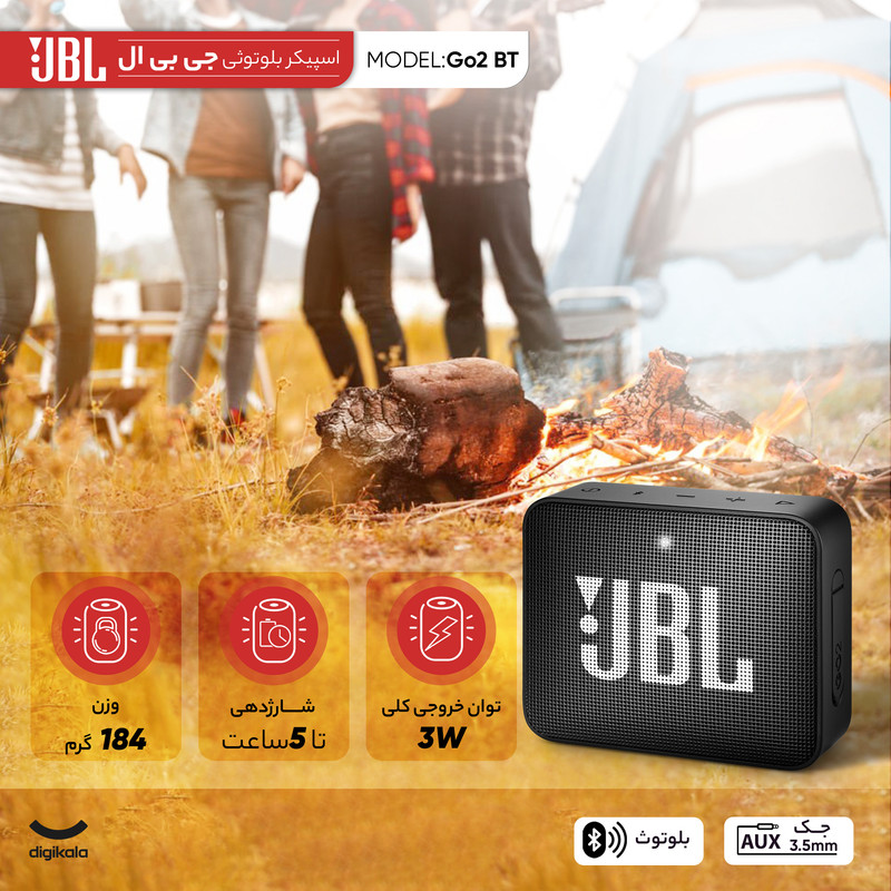 اسپیکر بلوتوثی جیبیال JBL GO 2 از سری محصولات تولید شده توسط کمپانی JBL است که به عنوان یک اسپیکر پرتابل روانه بازار شده است.این اسپیکر به دلیل وزن و حجم کم خود طرفداران بسیاری پیدا کرده است. JBL Go 2 نسبت به مدل قبلی خود تغییرات بسیار مثبتی داشته است و اولین تغییری که کاربران را متوجه خود خواهد کرد طراحی جدید و متفاوت آن است که زیبایی ظاهری این اسپیکر را دو چندان کرده است. از ویژگیهای این کالا میتوان کاملا مقاوم در برابر آب با استاندارد IPX7 ، قابلیت حمل آسان رنگبندی زیبا و جذاب بلوتوث نسخه 4 و 5 ساعت پخش مداوم دکمههای کنترل کننده؛ اتصال شارژر کاملا مقاوم در برابر آب با استاندارد IPX7 نام برد اسپیکر جیبیال JBL Go 2 دارای بدنهای مقاوم در برابر آب است. این اسپیکر به گونهای طراحی شده است تا شما بتوانید در عین حال که اسپیکر خود در آب غوطهور است، به پخش موسیقی بپردازید. همچنین امکان شستشوی این اسپیکر در هنگام کثیف شدن آن نیز برای شما فراهم شده است.این اسپیکر در اندازهای فشرده و کم حجم طراحی و تولید شده است تا شما بتوانید آن را در هر زمان، به هر مکان که مایل هستید منتقل کنید و از پخش موسیقی باکیفیت و شفاف لذت ببرید. در این اسپیکر کوچک یک عدد درایور فول رنج 1.5 اینچی با توان خروجی 3 وات استفاده شده است که قادر است فرکانسهای صدا را در بازه بین 180 هرتز تا 20000 هرتز پخش کند. کمپانی JBL برای اسپیکر بلوتوثی JBL GO 2 رنگهای متنوع و زیبایی در نظر گرفته است. بنابراین شما میتوانید این اسپیکر را در رنگهای متنوع و جذاب برای خود فراهم کنید. از روشهای اتصال به این اسپیکر بلوتوثی میتوان به روش باسیم و بیسیم اشاره کرد. برای اتصال به صورت باسیم میتوانید از ورودی 3.5 میلیمتری صدا و کابل AUX و برای اتصال بیسیم میتوان از بلوتوث تعبیه شده بر روی این دستگاه استفاده کرد. برای اتصال بیسیم با این دستگاه، تنها کافی است بلوتوث اسپیکر و منابع صوتی خود را روشن کنید و تنها با یک لمس ساده، به این اسپیکر متصل شوید و به پخش موسیقیهای باکیفیت خود بپردازید. این اسپیکر شارژی، انرژی خود را از طریق یک یک عدد باتری لیتیوم-یونی قابل شارژ با ظرفیت 730 میلی آمپر ساعت تامین میکند و با 2.5 ساعت شارژ قادر است تا 5 ساعت به صورت مداوم مورد استفاده قرار بگیرد